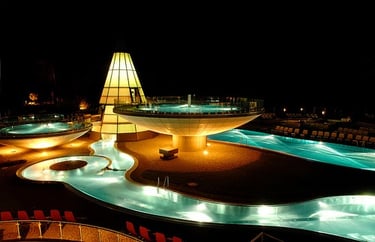 Il centro termale di Aqua dome sorge all’inizio della valle del Längenfeld ed è subito riconoscibile grazie al design futuristico delle sue vasche esterne e, in particolare, delle sue tre “navicelle spaziali”, piscine termali che pare galleggino nell’aria, dove si possono alternare getti idromassaggio, acqua solforosa e vasca salina (con un contenuto di sale al 5%).